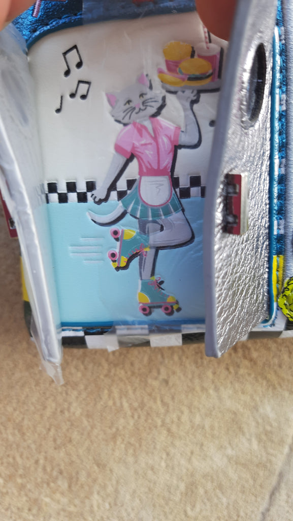 There is lots of fun going on behind the (opening) doors at Kitty's Diner. Kitty is busy on her roller skates delivering orders! What a gorgeous shimmery turquoise colour this bag is. This is a bag designed for FUN!