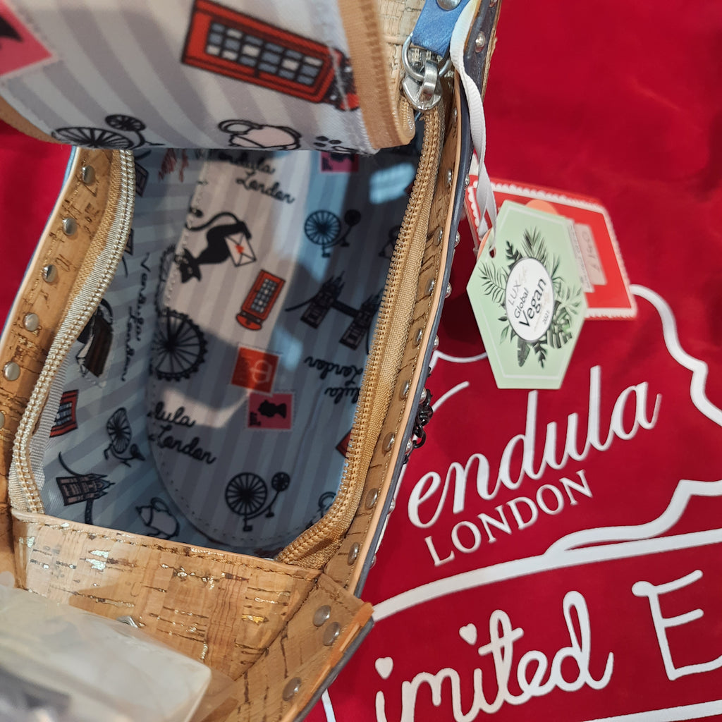 There is a shoulder strap which clips on to the sides of the handbag if required and which can be extended to a cross-body length.   It has a zip fastening on the top.  The inside lining is of course of a London theme!  There are four metal studs on the base of the handbag to protect it from damage.  All Vendula limited edition handbags come with a red velvet dust bag for storage and of course a serial number inside.