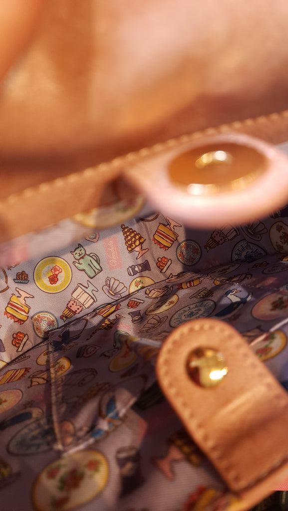 On the back there is a zip compartment and inside there is another zip compartment and a pocket.  The inside lining is a pretty tearoom theme.  All Vendula handbags come with a pink dust bag for storage.